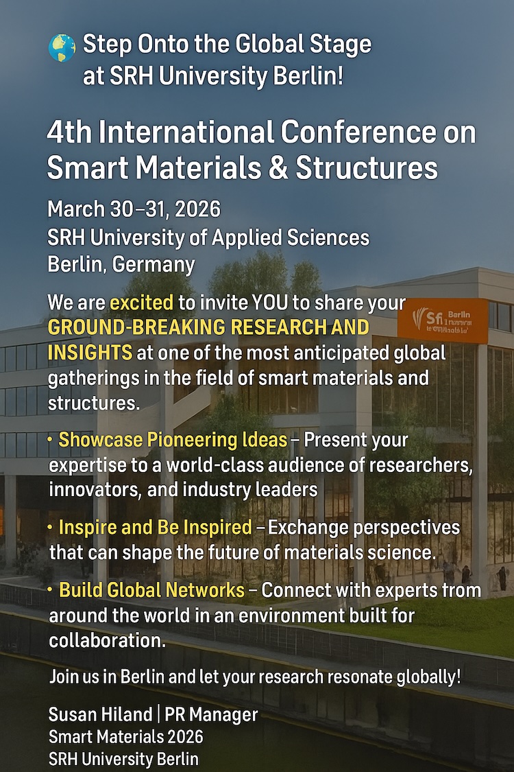 We are delighted to invite you to join Smart Materials 2026, taking place on March 30–31, 2026, in Berlin, Germany. This prestigious international conference will bring together leading minds from across the globe- directors, scientists, professors, postdoctoral researchers, scholars, and industry experts- to showcase ground-breaking research and explore the future of Smart Materials.